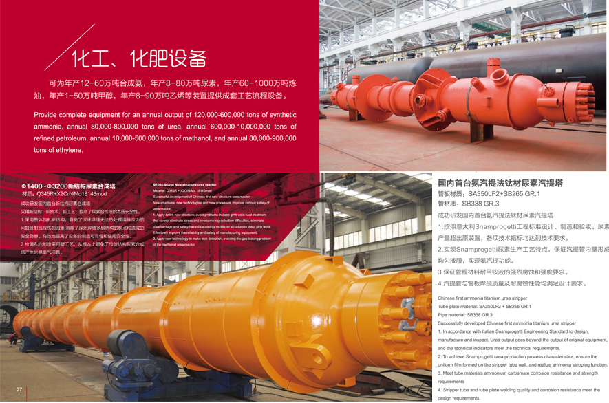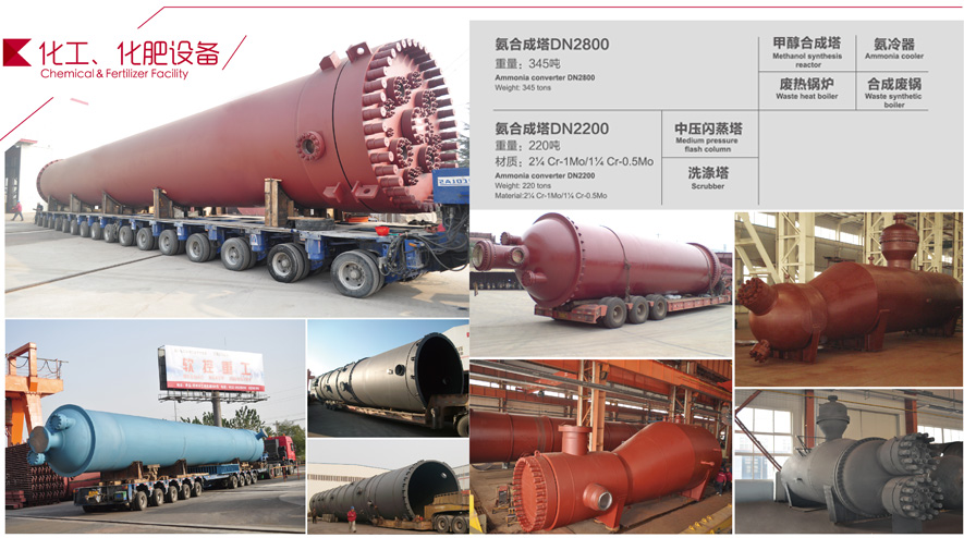 Shandong Yunyi Heavy Industry Co., Ltd. can produce 120,000-800,000 tons of synthetic ammonia, 80,000-1,200,000 tons of urea and 100,000-500,000 tons of methanol annually, and provide complete sets of process equipment for chlor-alkali, sodium silicate, synthetic rubber, PVC, polyethylene, aromatic hydrocarbon and ethylene glycol.
